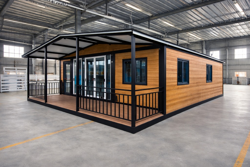 Vivienda modurlar con porche exterior y acabado con metal tallado tipo madera, diseñada para uso residencial. Adaptable en distribucion y necesidades del cliente.